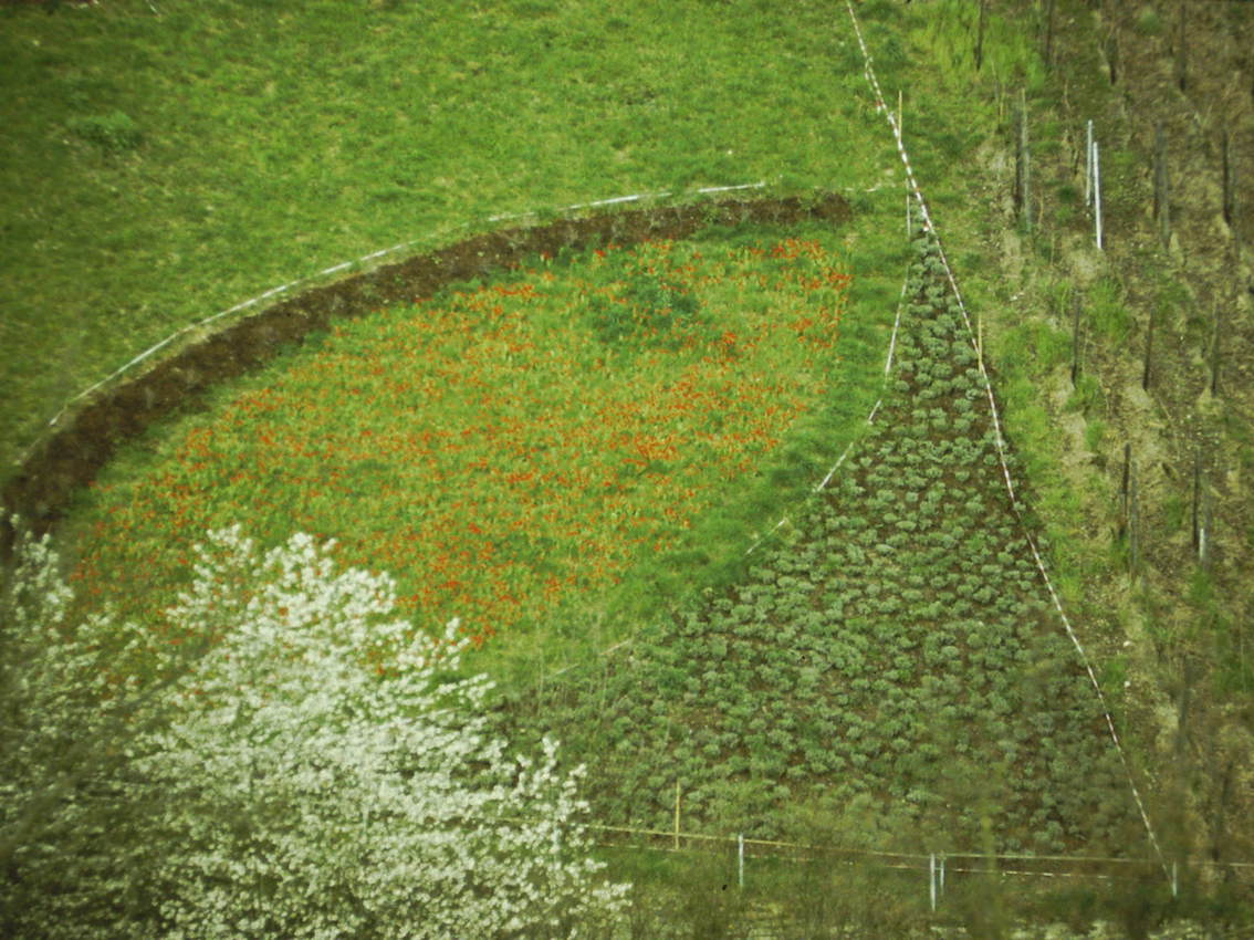 "Es ging immer um mehr. Ich bin Künstler. Die Ästhetik ist mein Werkzeug. Ich habe nicht als Landschaftsarchitekt dilettiert. Es ging darum, mit leicht zerstörbaren Pflanzen zu arbeiten. Ich wollte baulich nichts verändern, sondern die Pflanzen sollten die Landschaft verändern. Die Leute klauten hunderte von Tulpen, auch Lavendel, nachdem das Projekt bekannt wurde. Auch das ist ein Teil des Projekts. Ich wollte Ihnen zeigen: Ihr habt was, Ihr könnt damit etwas machen! Ich wollte aber auch ein Bild machen. Die größte Möglichkeit des Künstlers ist ja seine Frechheit. Er kann seine Vorstellungen direkt vorbringen. Deshalb ist so ein Bild in der Landschaft ein Bild auf die Hoffnung auf Veränderung. Das Projekt hat sehr viel bewirkt in der Landschaft. Es ist 20 Jahre her und die Landschaft sieht heute anders aus als damals. Außerdem habe ich das Projekt mit Zeichnungen, Skizzen, Aquarellen und Drucken begleitet."
